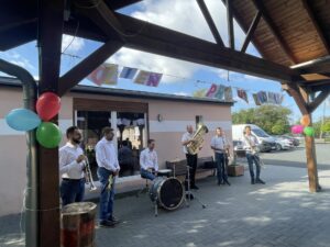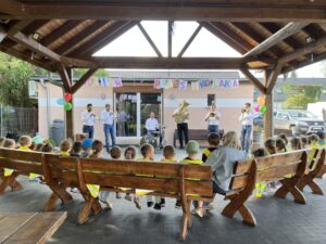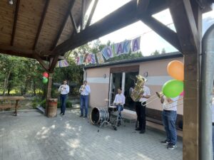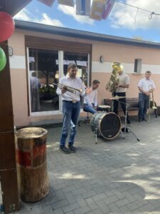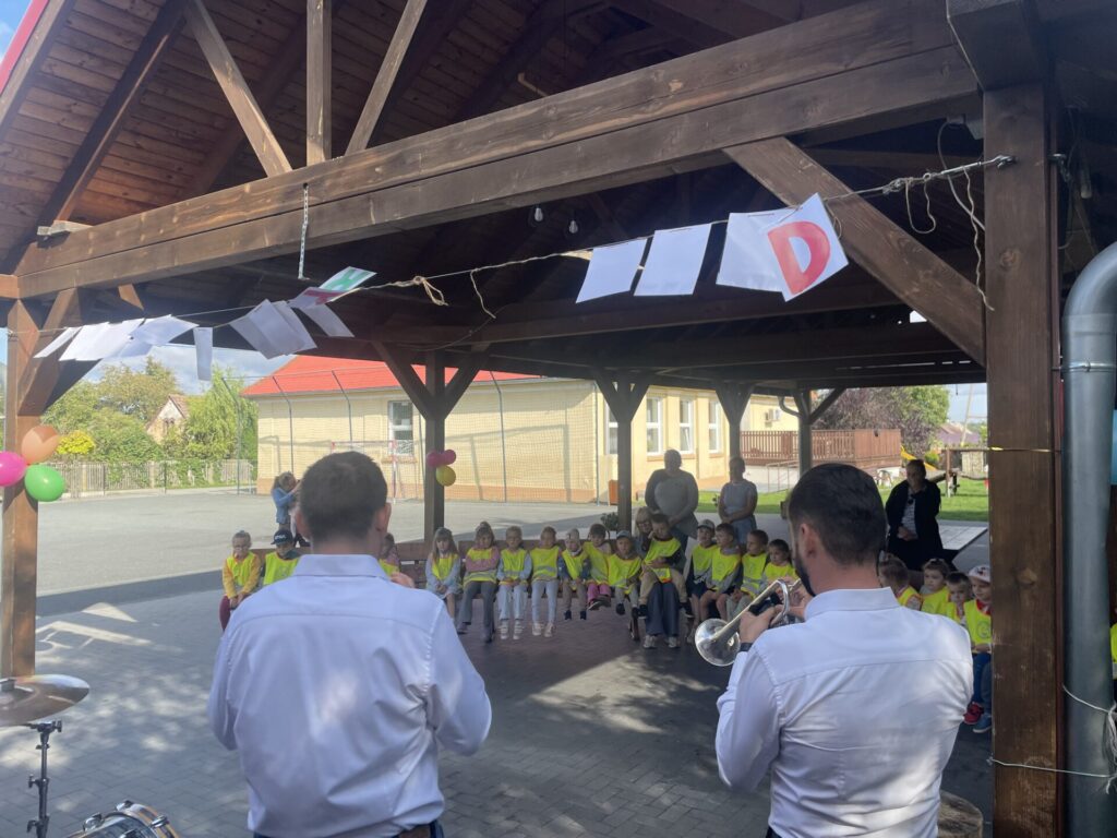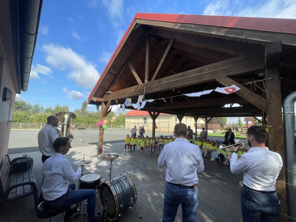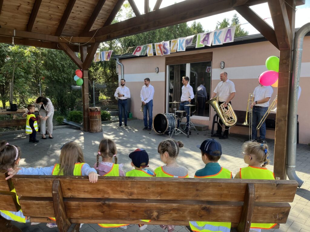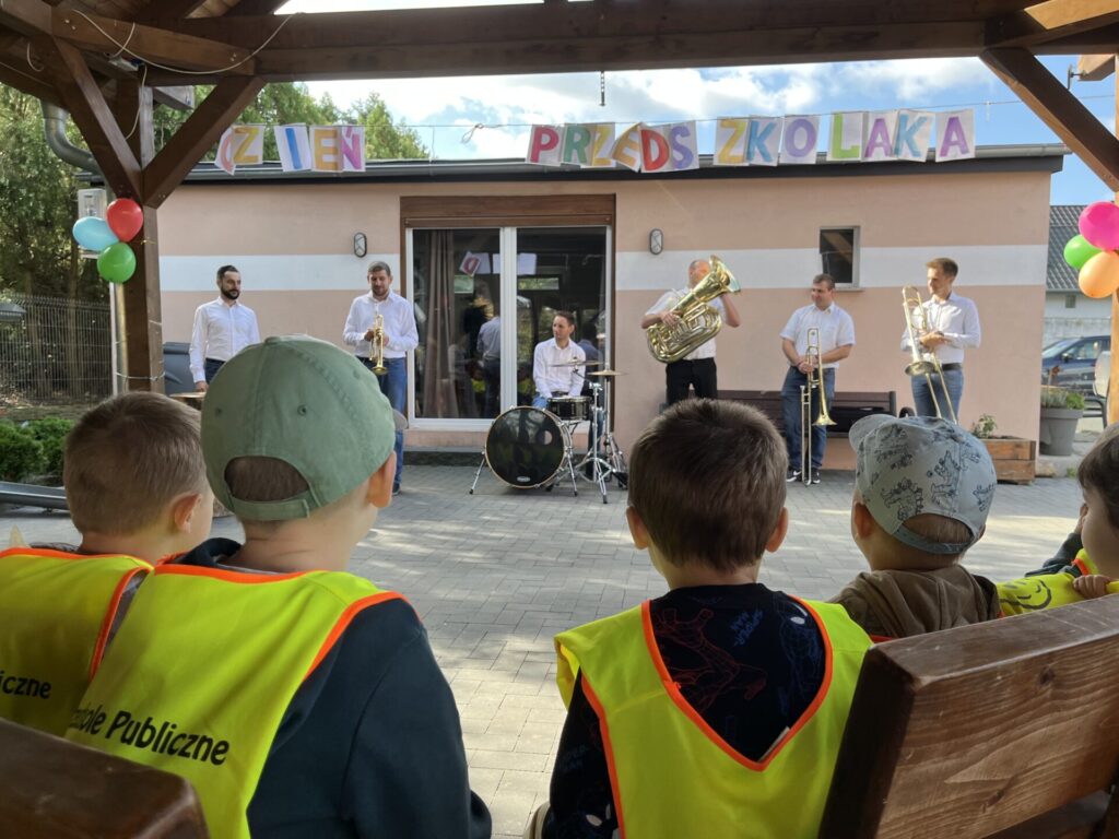 Pierwszą atrakcją był koncert zespołu muzycznego „Kapela bez nut”. Dzieci z wielkim zainteresowaniem i skupieniem słuchały utworów granych na żywo. Artyści nie tylko zaprezentowali piękne melodie, ale także opowiedzieli o instrumentach, na których grali. Przedszkolaki miały okazję posłuchać dźwięków trąbki, puzonu i perkusji, poznając ich brzmienie i rolę w zespole muzycznym.