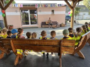 Drugą niespodzianką był koncert gitarowy. Pan gitarzysta zaśpiewał dzieciom znane i lubiane piosenki, a następnie zaprosił wszystkich do wspólnej zabawy muzycznej. Przedszkolaki z radością wzięły udział w rytmicznych zabawach, śpiewach i tańcach, pokazując, ile energii i radości drzemie w małych artystach.