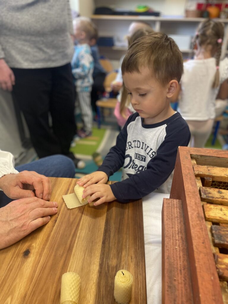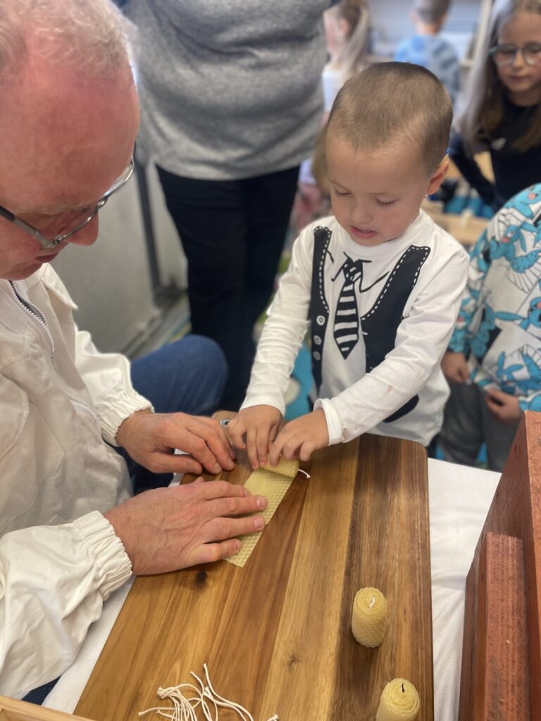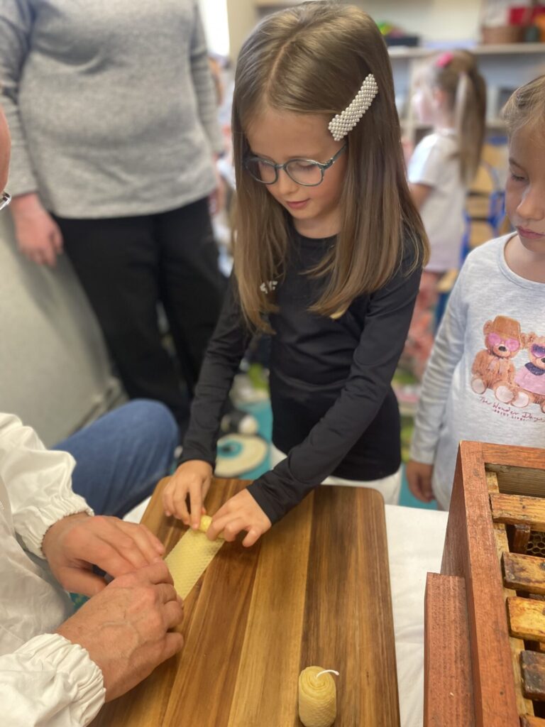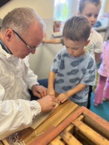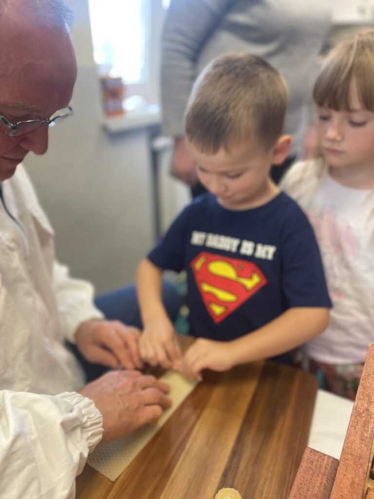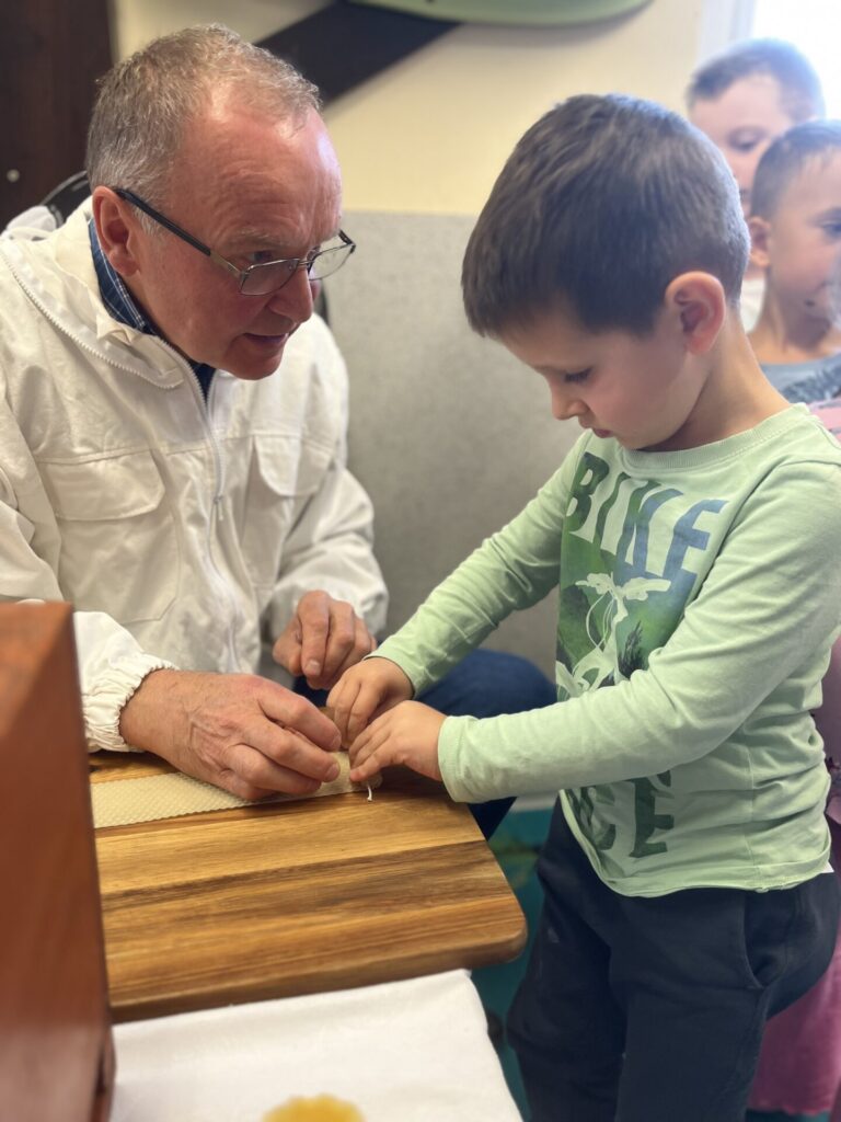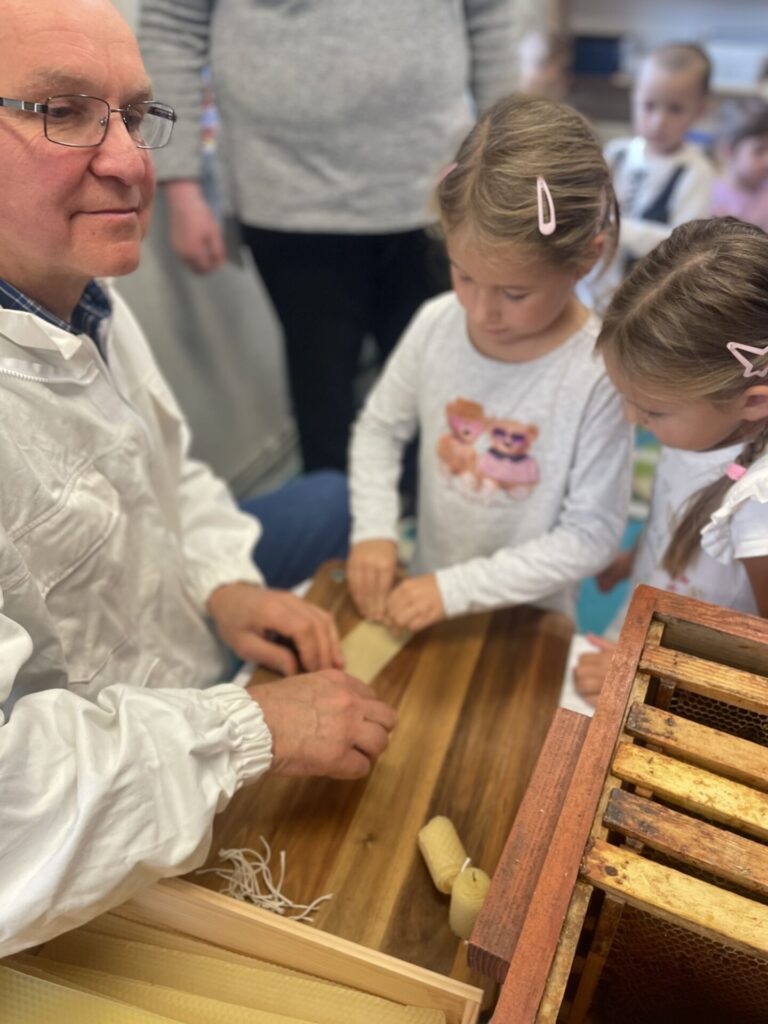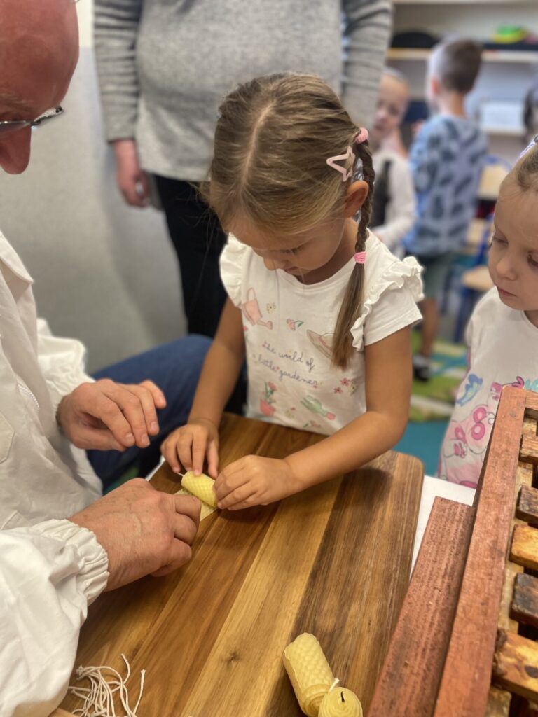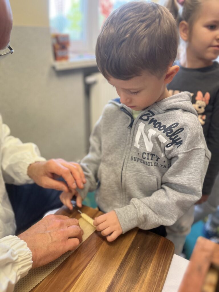 Na zakończenie każde dziecko wykonało własną świeczkę z naturalnego plastra wosku pszczelego, którą mogło zabrać do domu jako pamiątkę z tego wyjątkowego dnia. Praca z woskiem była nie tylko świetną zabawą, ale także okazją do rozwijania zdolności manualnych i poznania zapachu prawdziwego pszczelego wosku.