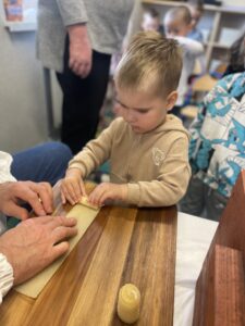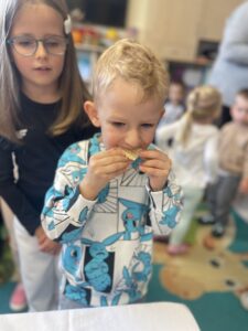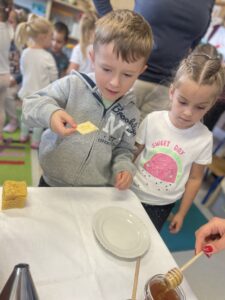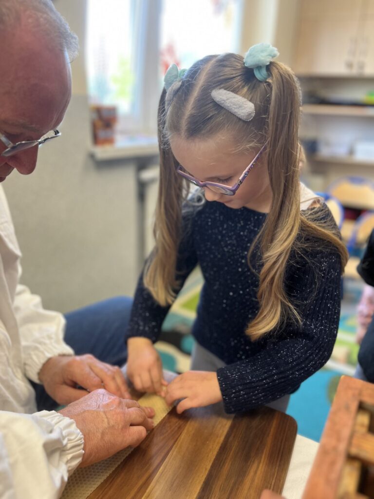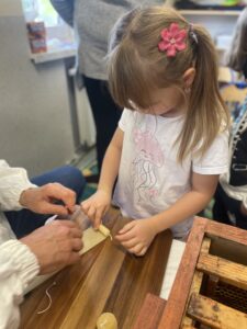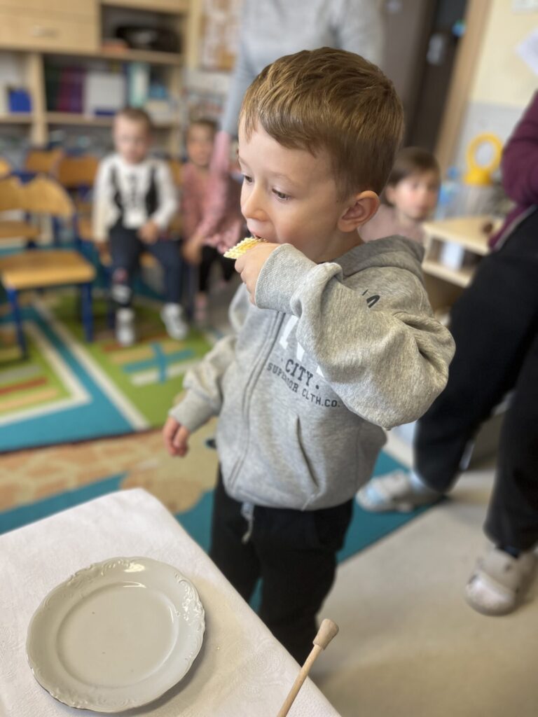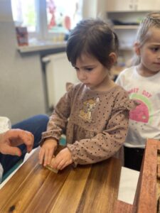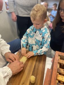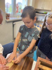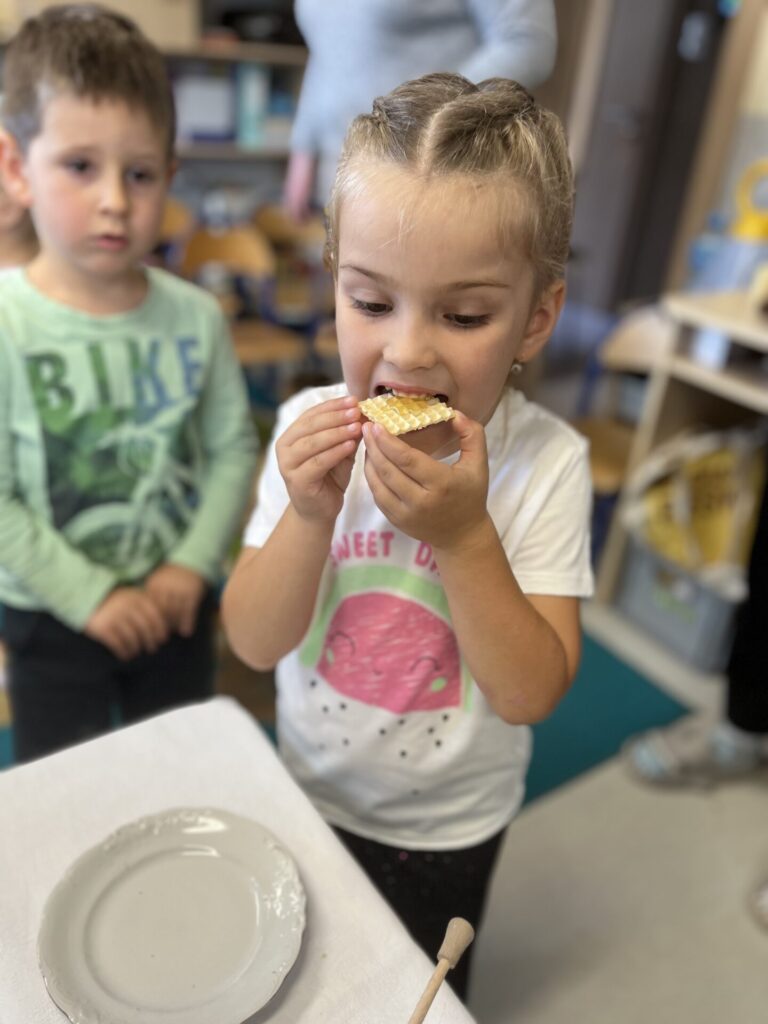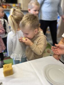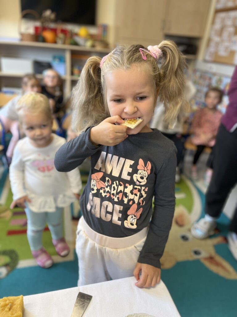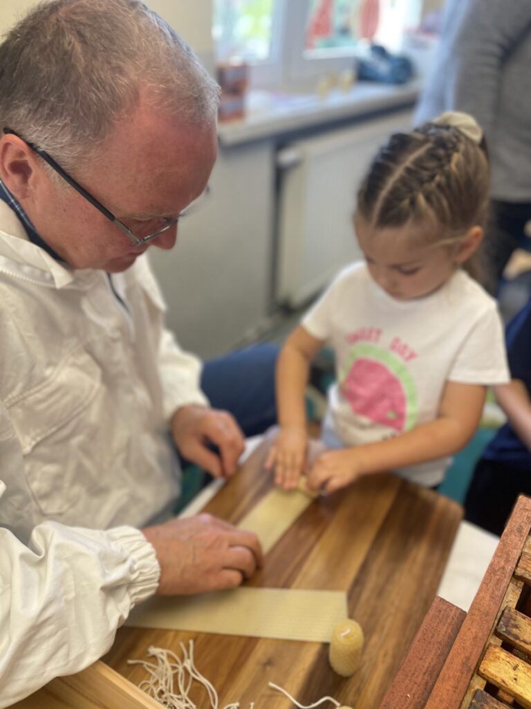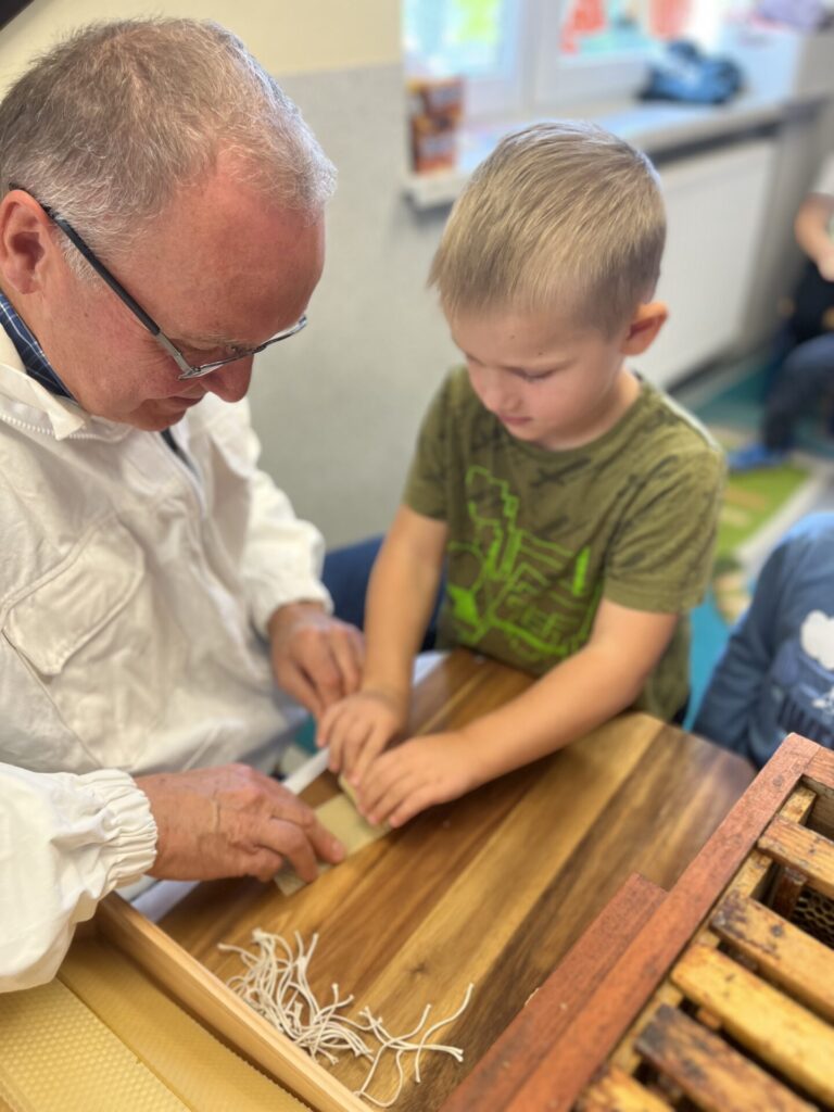 Na zakończenie każde dziecko wykonało własną świeczkę z naturalnego plastra wosku pszczelego, którą mogło zabrać do domu jako pamiątkę z tego wyjątkowego dnia. Praca z woskiem była nie tylko świetną zabawą, ale także okazją do rozwijania zdolności manualnych i poznania zapachu prawdziwego pszczelego wosku.