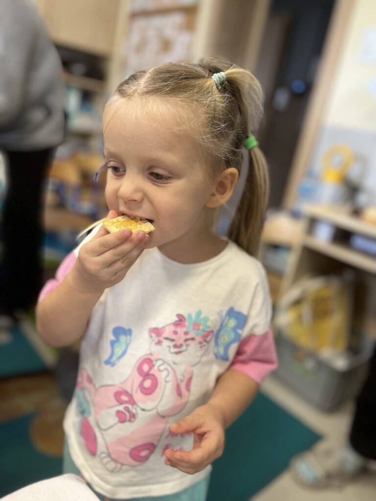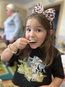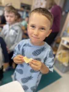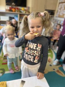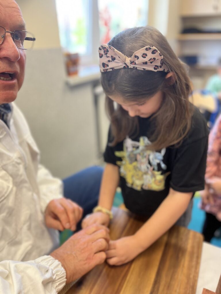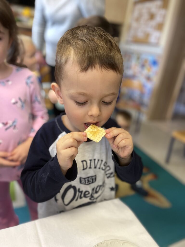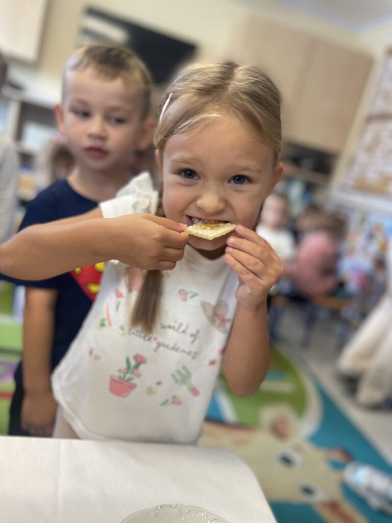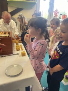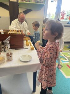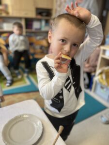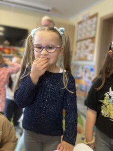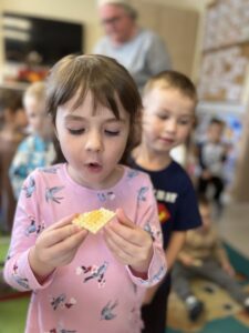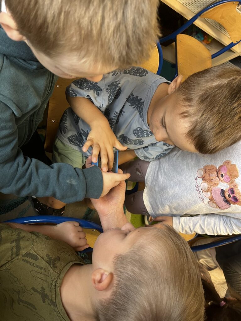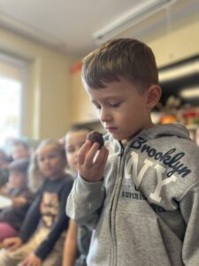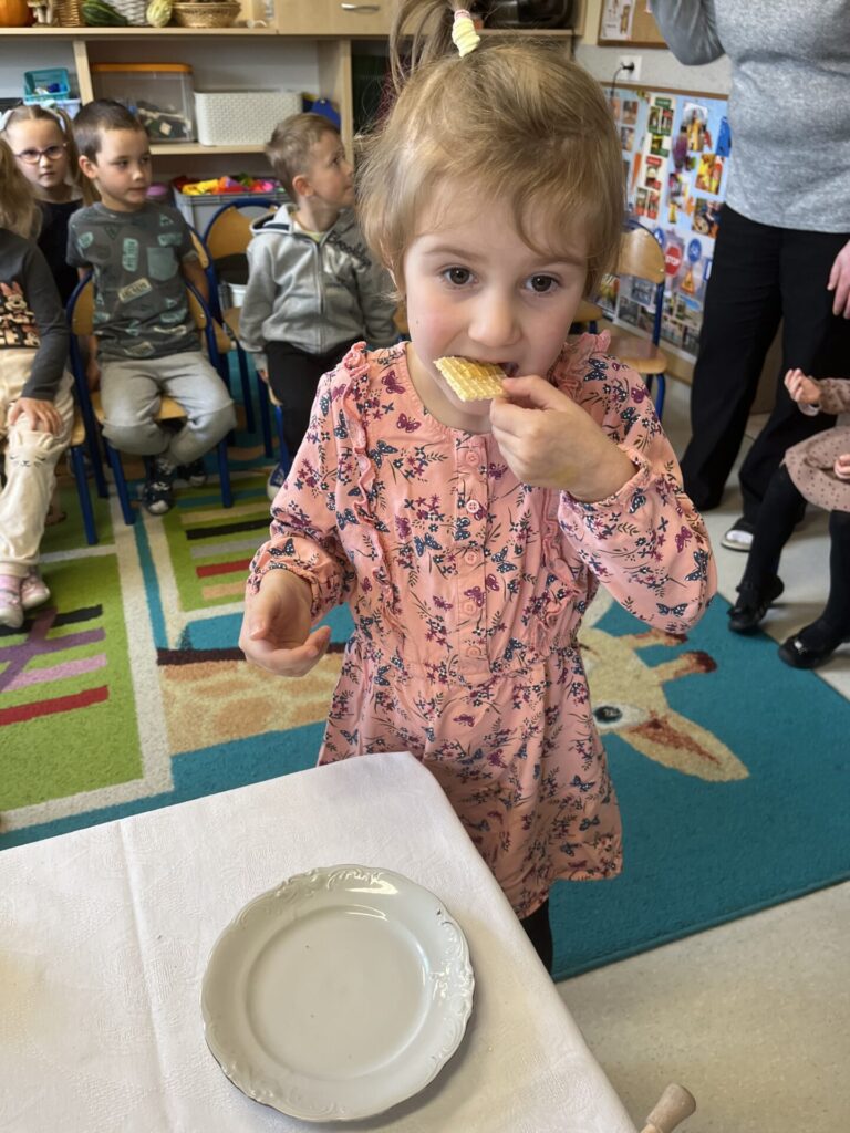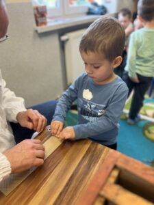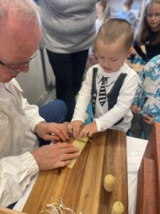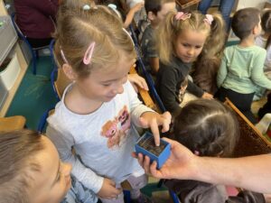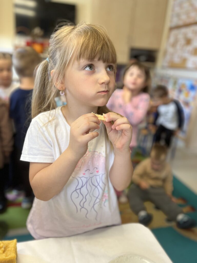 Na zakończenie każde dziecko wykonało własną świeczkę z naturalnego plastra wosku pszczelego, którą mogło zabrać do domu jako pamiątkę z tego wyjątkowego dnia. Praca z woskiem była nie tylko świetną zabawą, ale także okazją do rozwijania zdolności manualnych i poznania zapachu prawdziwego pszczelego wosku.