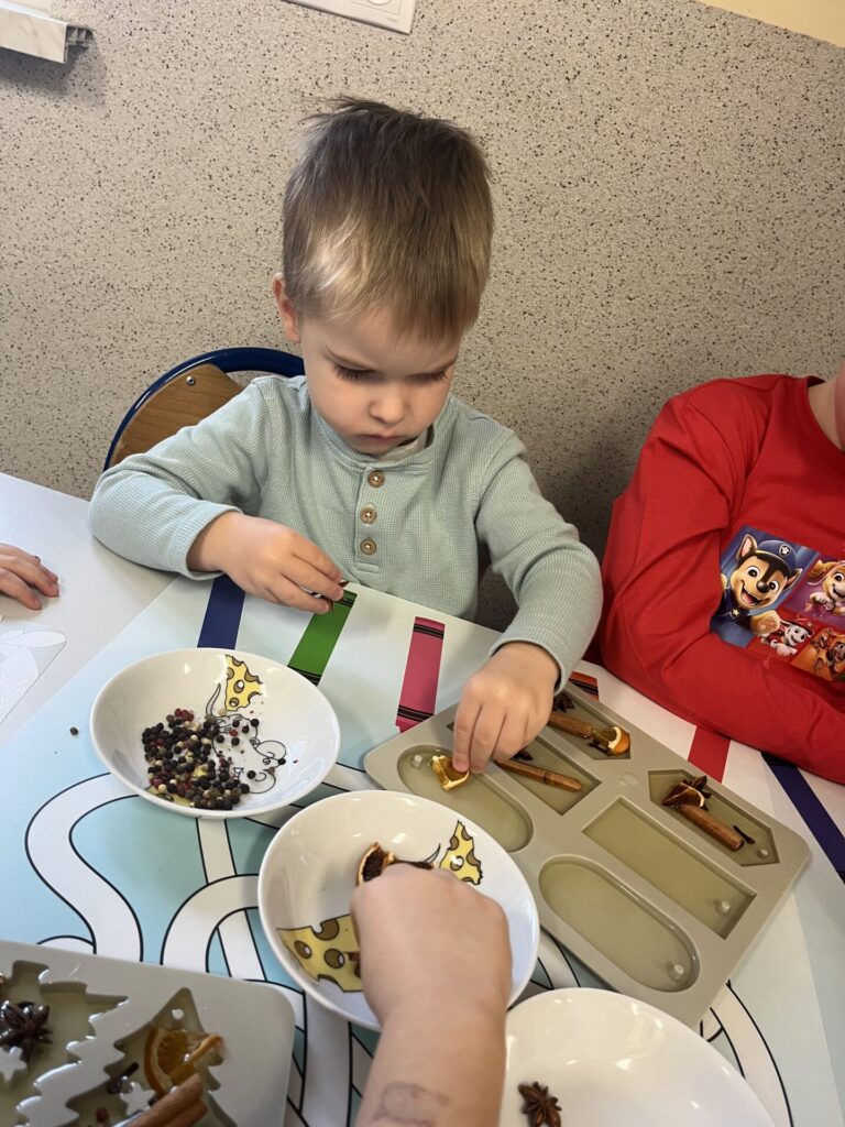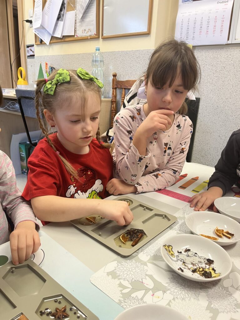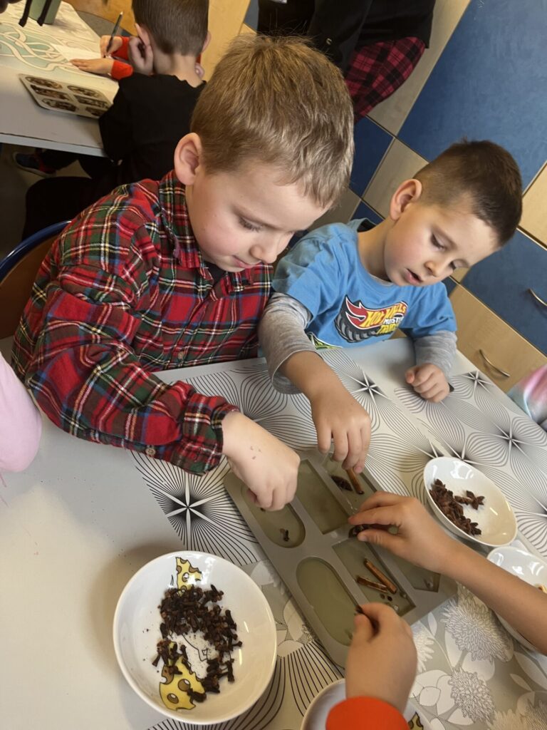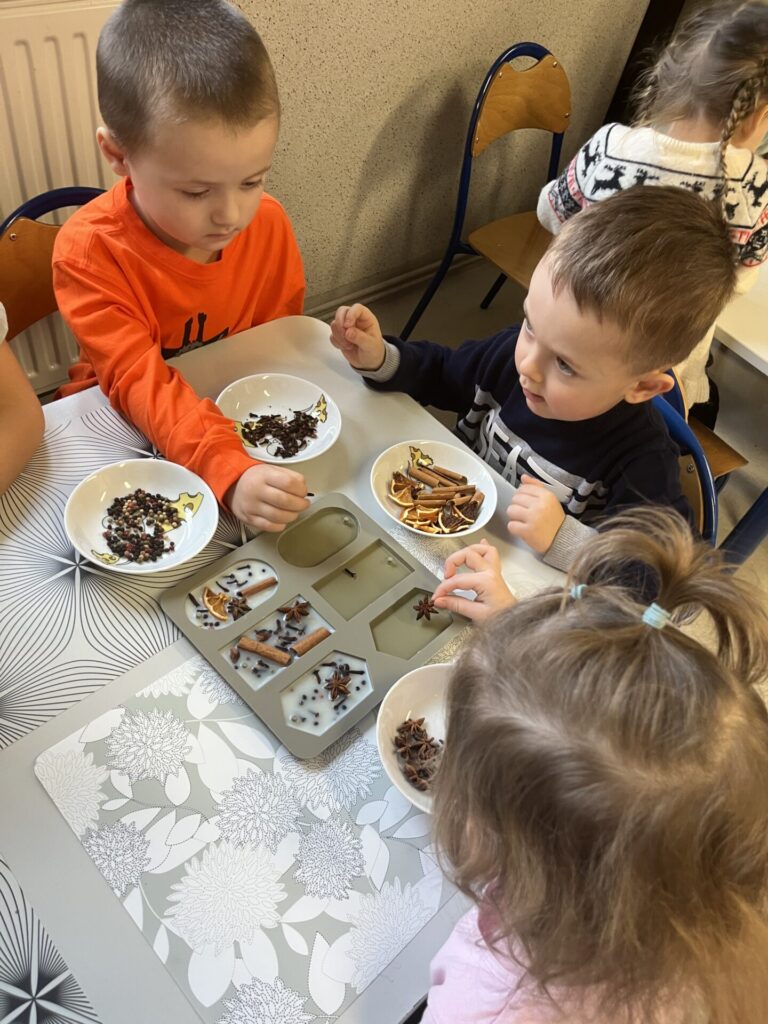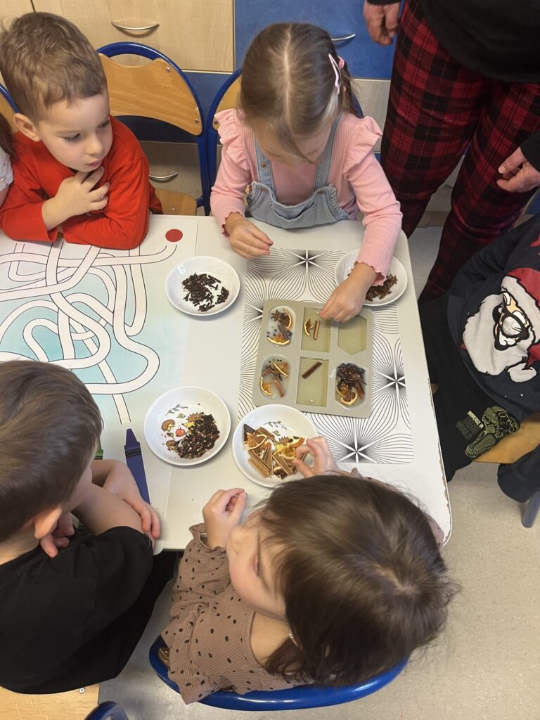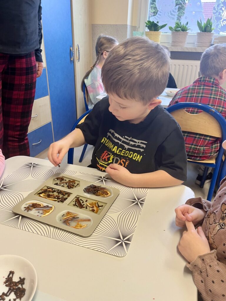 Pod czujnym okiem Pani Adriany przedszkolaki komponowały pachnące ozdoby, wykorzystując aromatyczne dodatki: anyż, laskę cynamonu, plasterek pomarańczy, goździki oraz kolorowy pieprz. Każde dziecko mogło samodzielnie zdecydować o kolorach i zapachu swojej zawieszki, dzięki czemu powstały prawdziwie wyjątkowe i pełne kreatywności prace.