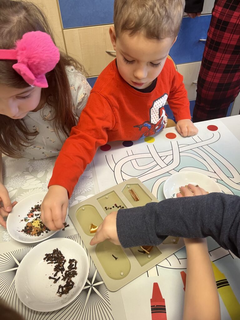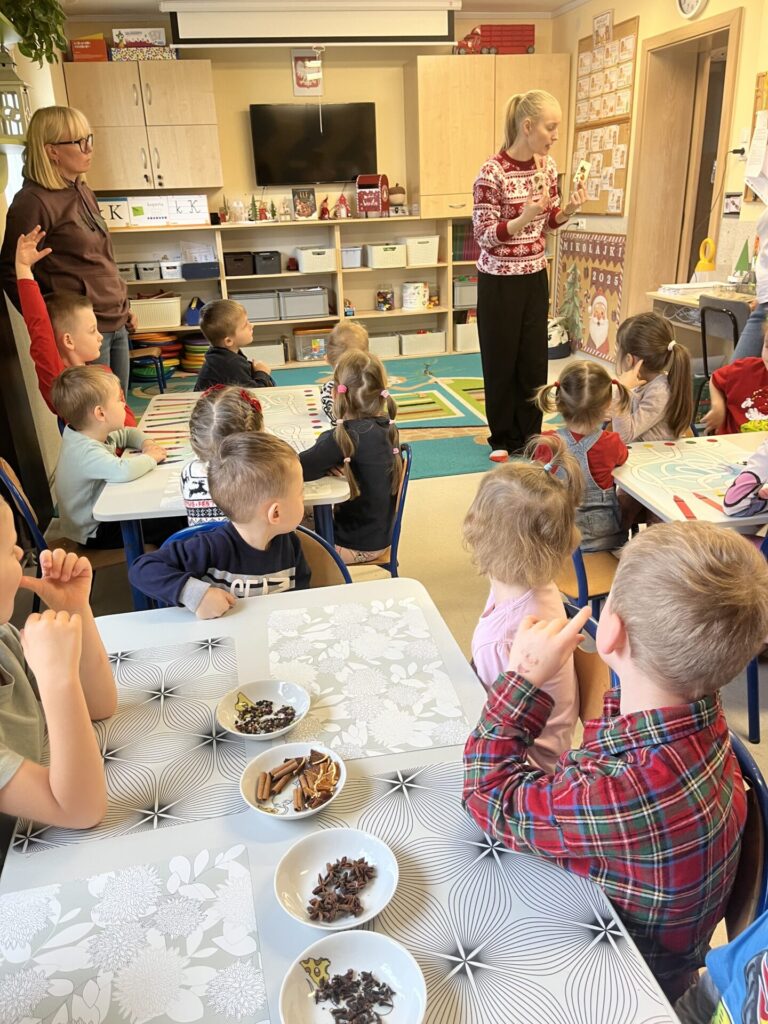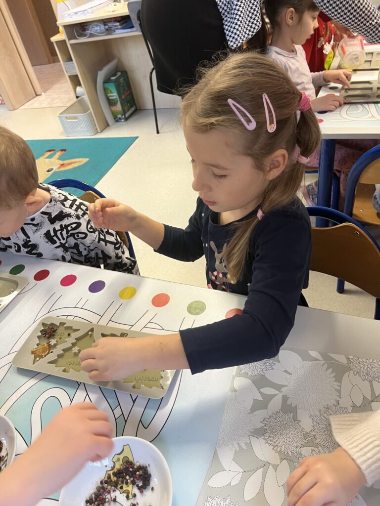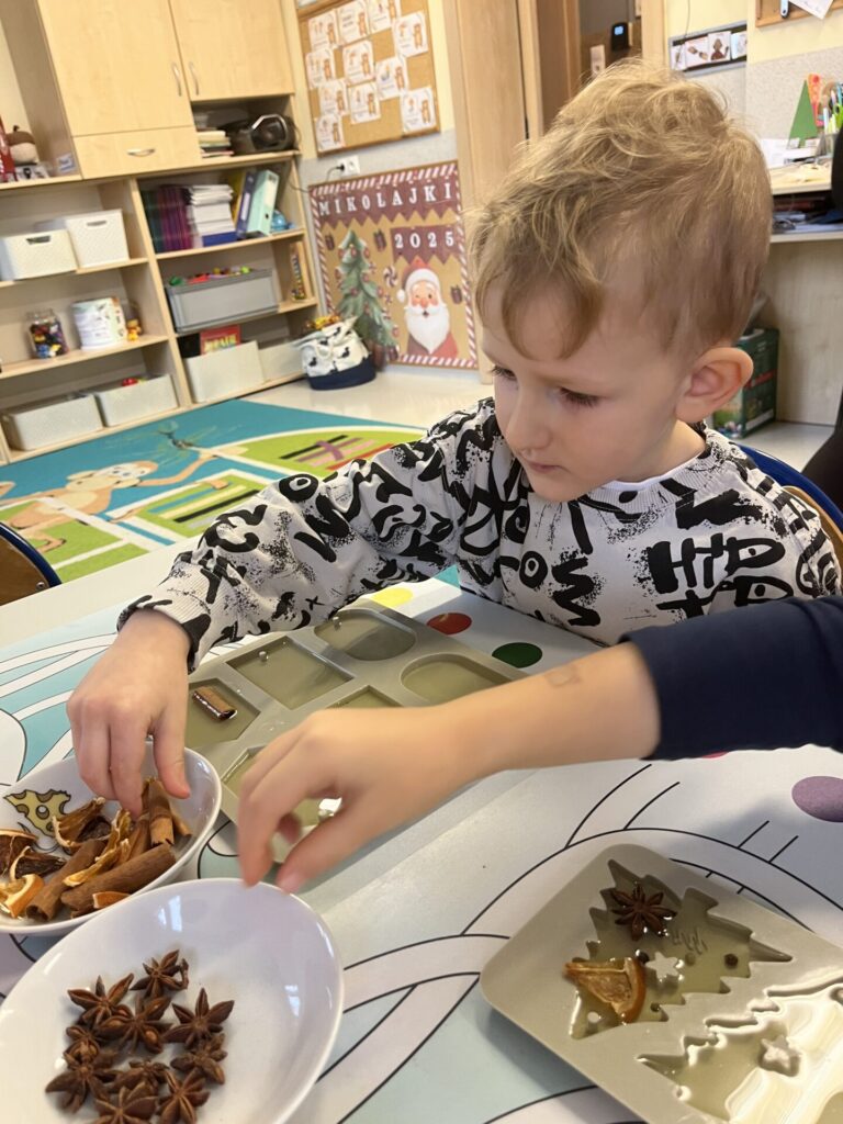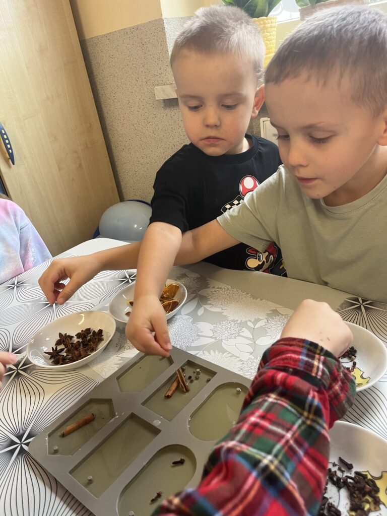 Pod czujnym okiem Pani Adriany przedszkolaki komponowały pachnące ozdoby, wykorzystując aromatyczne dodatki: anyż, laskę cynamonu, plasterek pomarańczy, goździki oraz kolorowy pieprz. Każde dziecko mogło samodzielnie zdecydować o kolorach i zapachu swojej zawieszki, dzięki czemu powstały prawdziwie wyjątkowe i pełne kreatywności prace.