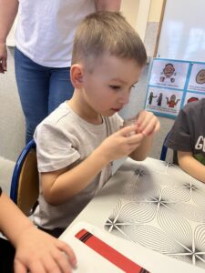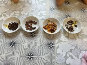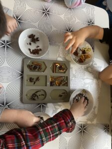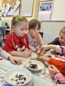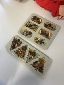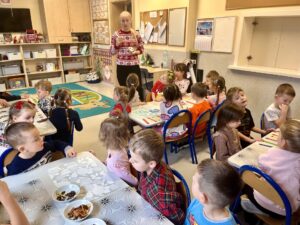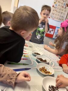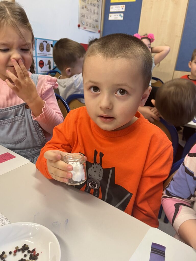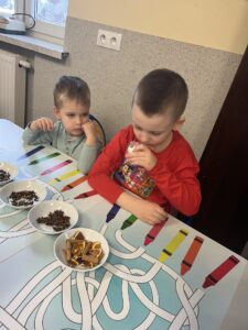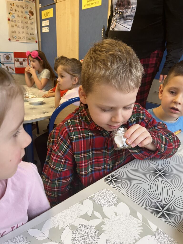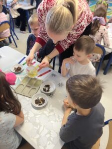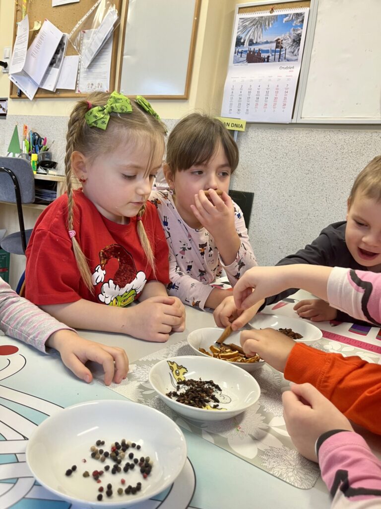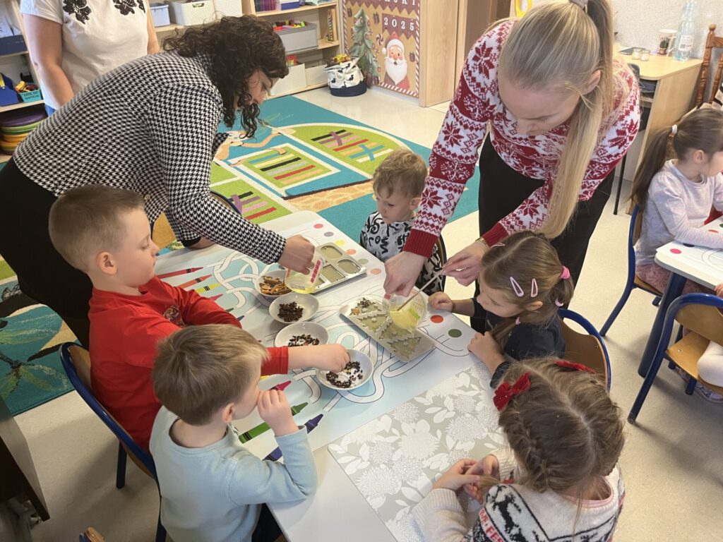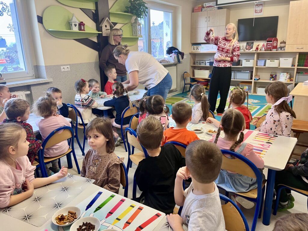 Pod czujnym okiem Pani Adriany przedszkolaki komponowały pachnące ozdoby, wykorzystując aromatyczne dodatki: anyż, laskę cynamonu, plasterek pomarańczy, goździki oraz kolorowy pieprz. Każde dziecko mogło samodzielnie zdecydować o kolorach i zapachu swojej zawieszki, dzięki czemu powstały prawdziwie wyjątkowe i pełne kreatywności prace.